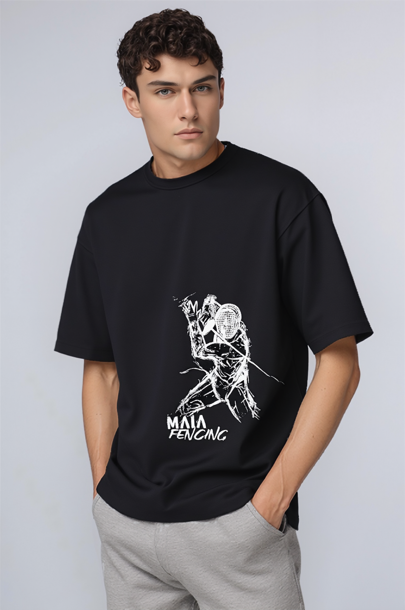Erkek Siyah Renkli Fencing Kabartma Baskılı Oversize Tişört
